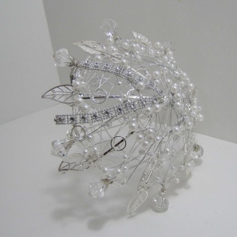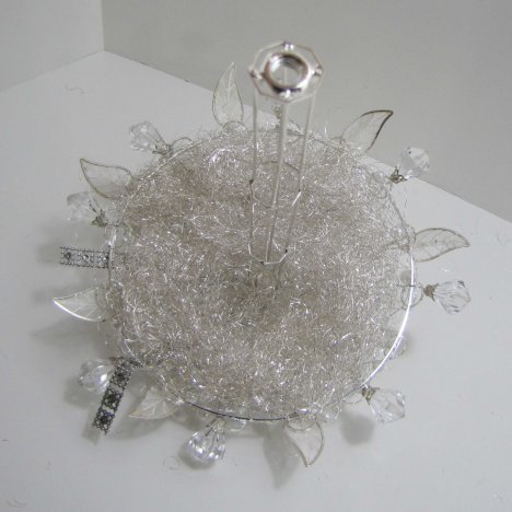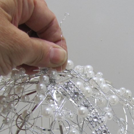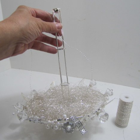 The first you will nest inside the armature frame. This will help conceal the underside and mechanics of the crystal bouquet. Reserve enough of the angel wire to wrap around the handle as well.