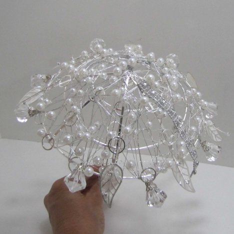 Thread your silver bullion wire through the armature and to the end of the rhinestone or pearl chain. Some of the appliques can be used to wrap around the handle later if desired. (Note: A padded foam meant to slide onto the handle comes with the bouquet armature to make this easier. It just slips over the handle).