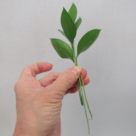 Wiring individual leaves is easy. Simply thread a green enameled floral wire (gauge 26) through the individual leaf in a stitch pattern. Bend and tape to give the leaf an individual stem. Thread the wire like a thread stitch through the bottom of the leaf. Press your thumb and forefinger over the leaf where the stitch is and then bend the wire ends down parallel to the stem.