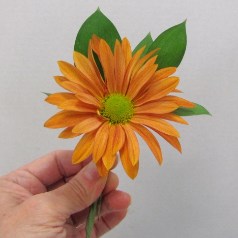 The single stem of ruscus looks good behind the daisy head, but I want a few more leaves in exact places. Remember - paying attention to detail is what gets your flower designs noticed.