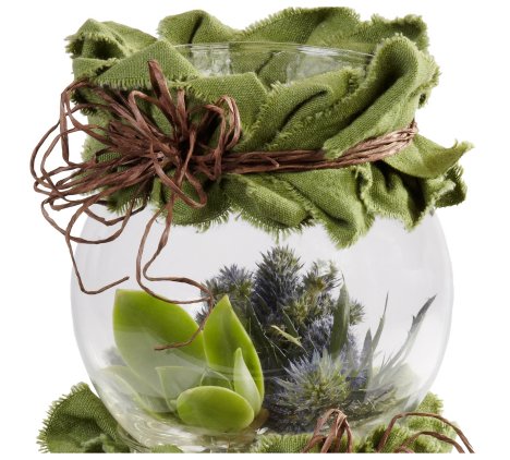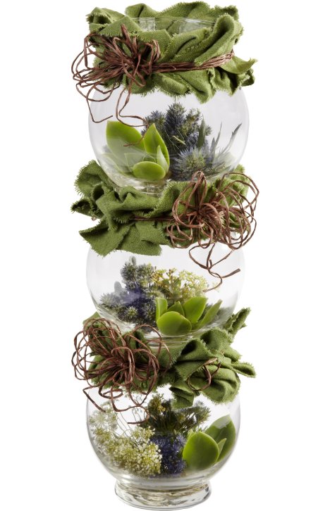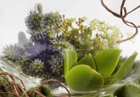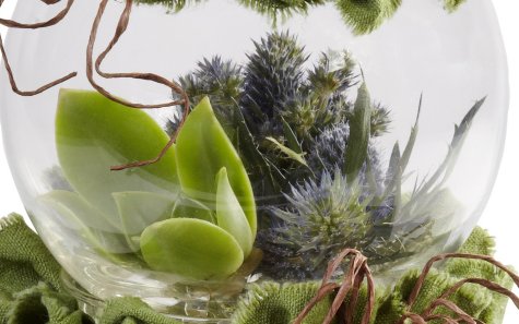 Begin by arranging the thistle, Queen Anne's lace and the succulent leaves in each bubble bowl as shown in the closeups below.