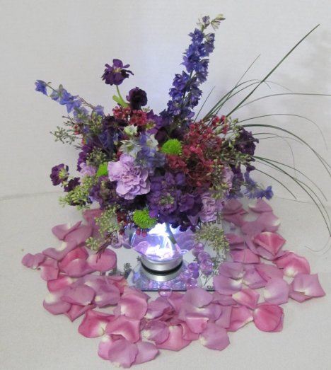 Want to go all out? Flower in a large table wreath and carefully place your trumpet vase in the open center of the flowers. I tossed a few rose petals in the bottom so I can put a push light in the center of the trumpet vase.