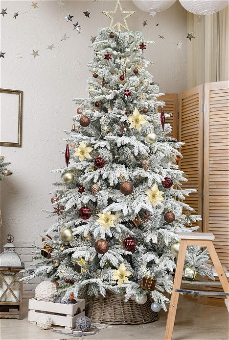 The decor is shown on a flocked Christmas tree. You can find everything from the round ornaments to the creamy white poinsettias ready to remove from the box and hang on the tree.