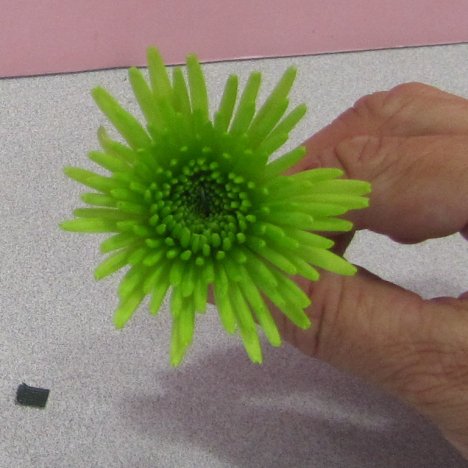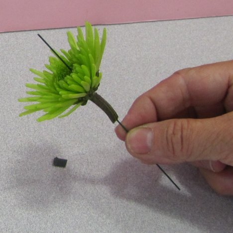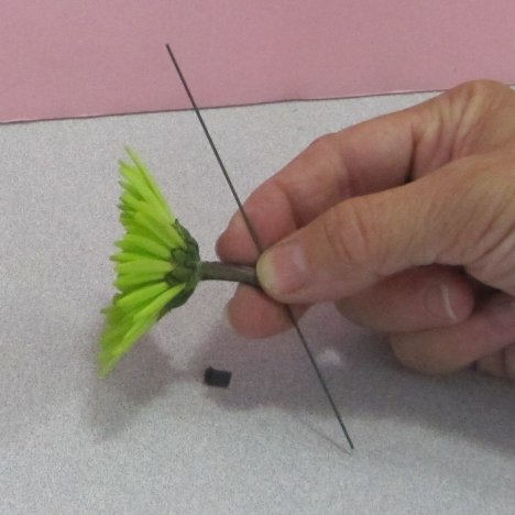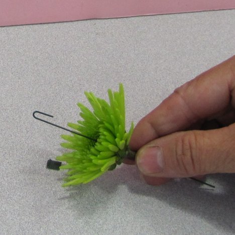 Pull the wire downward until the hook is concealed in the center of the flower. The longer wire stem comes out the bottom.