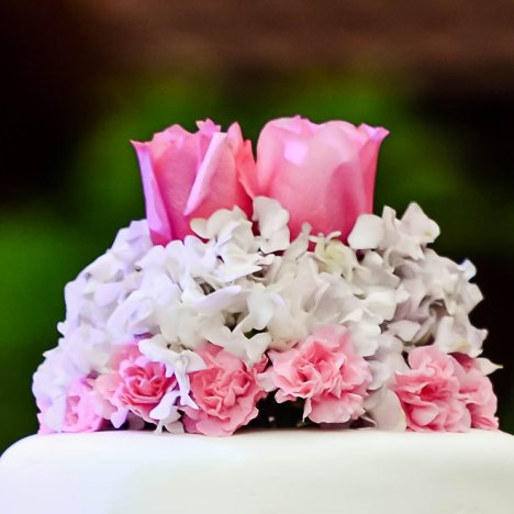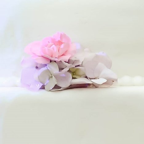 Lightly mist your flowers with Finishing Touch before laying them on the cake. Allow time for the flower sealant to dry. This helps lock the moisture into the flower petals and slows the wilting process. This is particularly important for hydrangeas, as they tend to wilt quickly without a flower source.