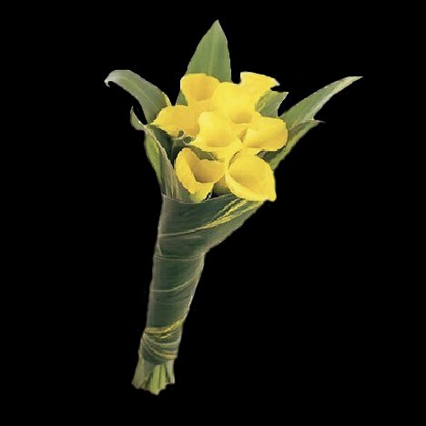 This calla lily wedding bouquet features bright yellow blooms wrapped in Masajeana leaves. The simple design is easy to make and features a cool elegant design.
