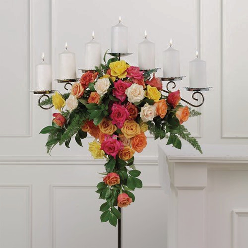 These candelabra flowers feature roses of many colors, but can be easily changed to monochromatic colors (all one color or hues of one color) or to a combination more to your liking. To recreate a similar look, you'll need the following florist supplies, hard goods and fresh flowers: