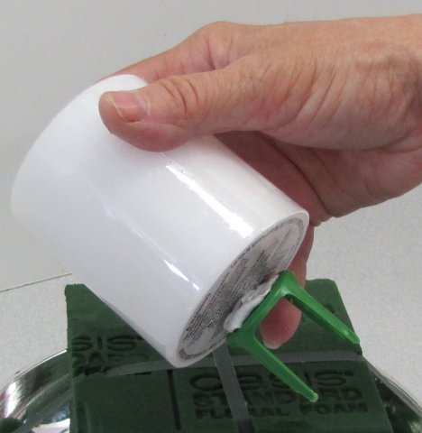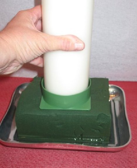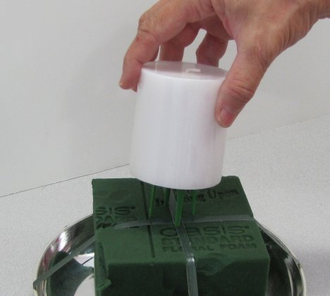 If necessary, use waterproof tape and tape several shortened wooden stakes around the bottom of the pillar candle. Then insert into the foam. The wooden stakes are made of a porous wood that will swell when wet and keep the candle securely in place. These size candles are heavier and can usually be transported in the centerpieces.