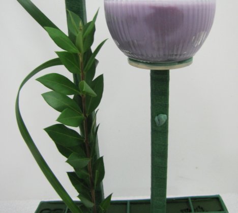Concealing your mechanics is Floristry 101. I inserted a tall piece of Italian Ruscus right next to the tallest extension rod to help conceal the rod. I also place another small ball of floral clay to the side of the second extension rod.