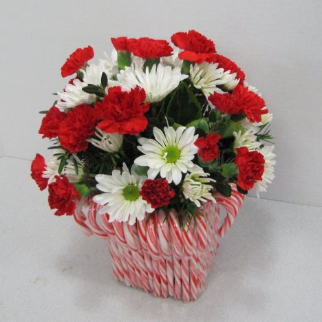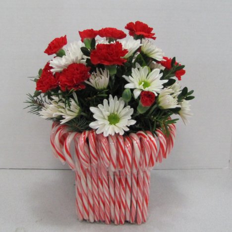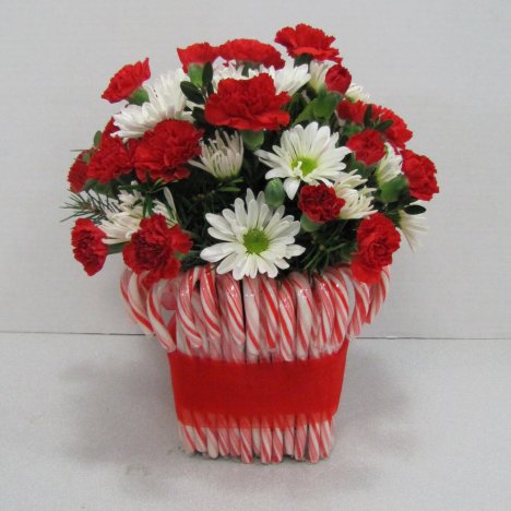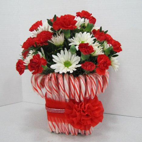 Once I am finished with my basic flower placement, I'm going to cover up the mechanics that was involved in keeping the candy canes in place.