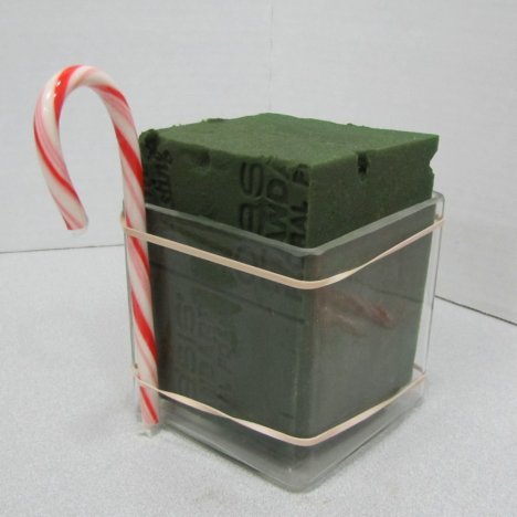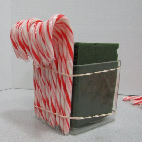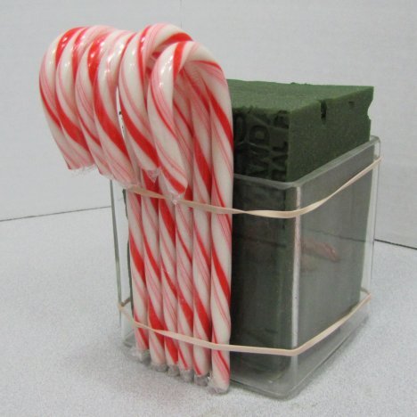 Once started. these Christmas centerpieces assemble quickly. Once the first piece of candy is in place, you simply continue placing the canes around the vase, placing them snugly against one another. If you wish - simply use clear cellophane tape and tape each one individually into place.