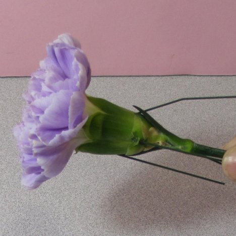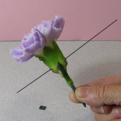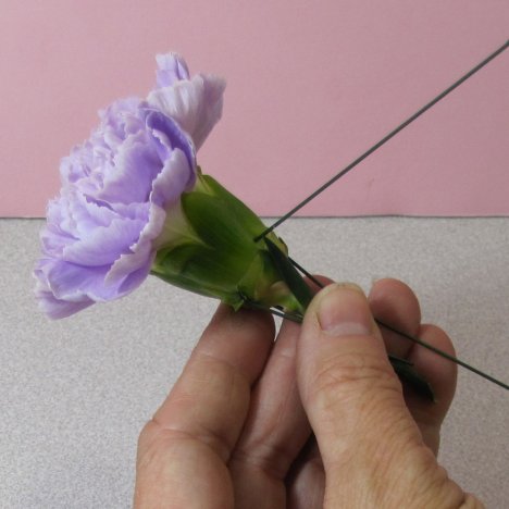 Pierce the flower from the side using florist wire. Any heavier and the wire will be hard to bend and will make for a bulky stem. Lighter wires are harder to push thru the fresh flower without bending.