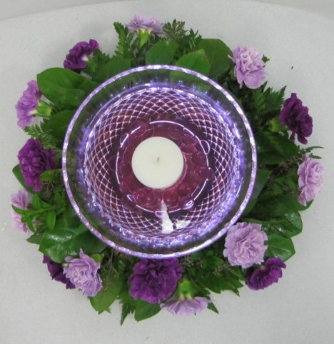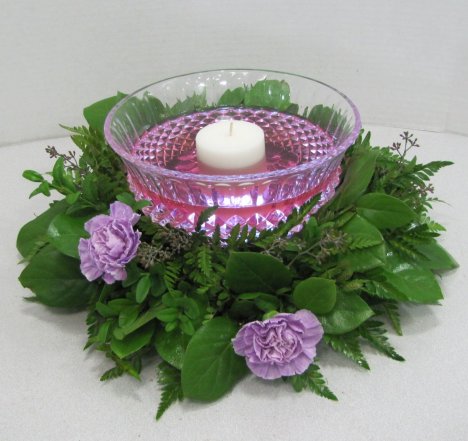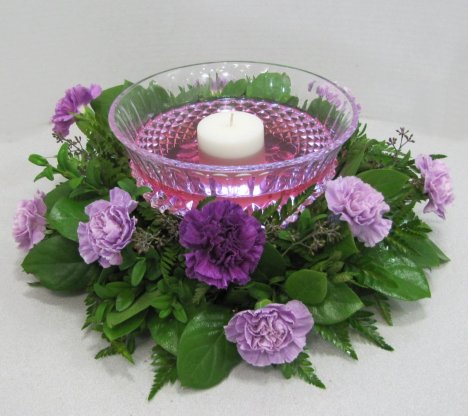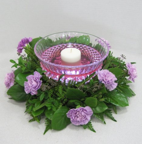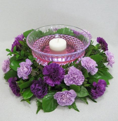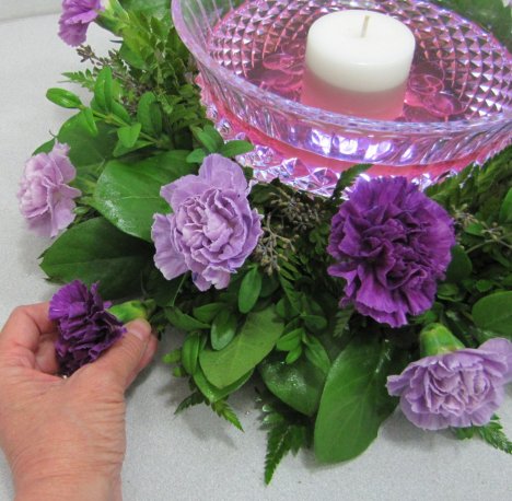 I've inserted eight lavender standard carnations completely encircling the center bowl.
