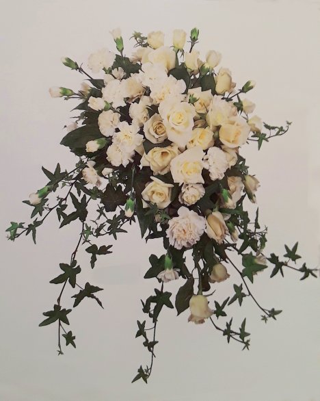 Frame the bouquet with the ivy and cocculus. Insert the roses and carnations as shown in the photo below. If you need more help with design techniques (such as greening or flowering) check out the beginning tutorials in the first Cascading Bouquet Gallery. You will also need to read processing your fresh flowers, as well.