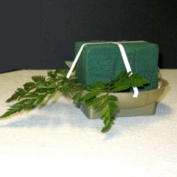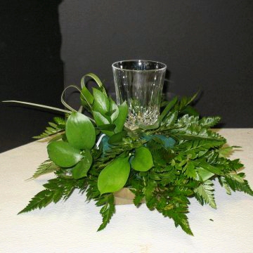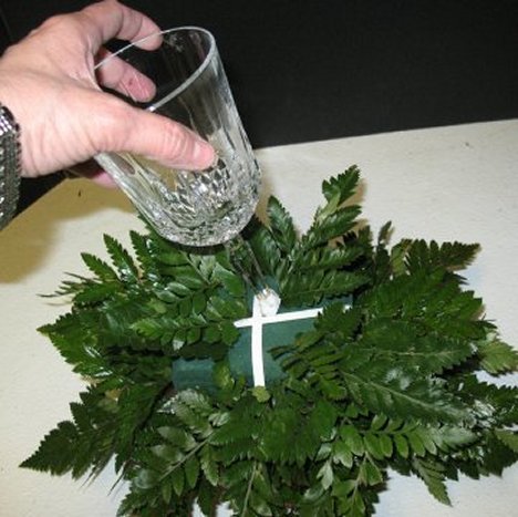 Start greening in around the bottom. The first greens should be angled slightly upwards in the foam. This will make it so that the tips of the ferns will brush the table top. It conceals the plastic container, which is why florists sometimes refer to them as "no show" containers.