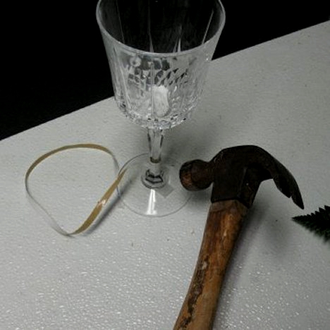 Tape the bottom of your glass up an inch or so. Wrap a paper bag around the base and gently tap with the hammer.
