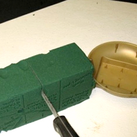 Oasis Max-Life foam is one of the best! It's scored on the sides for easy cutting into halves or thirds. Allow your brick to "float soak" in a pan or bucket of water. This means you don't try to speed it up by forcing it under the water line. It saturates very quickly anyway. Forcing it under could cause dry pockets that could mean early wilting for any flower stem unlucky enough to be inserted into it.