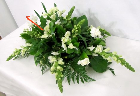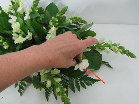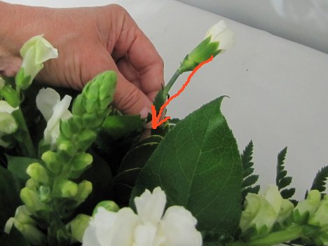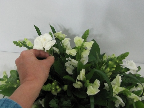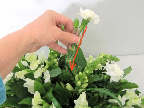 Begin by inserting the lower flowers at a slightly downward angle, just like you did with the snapdragons.