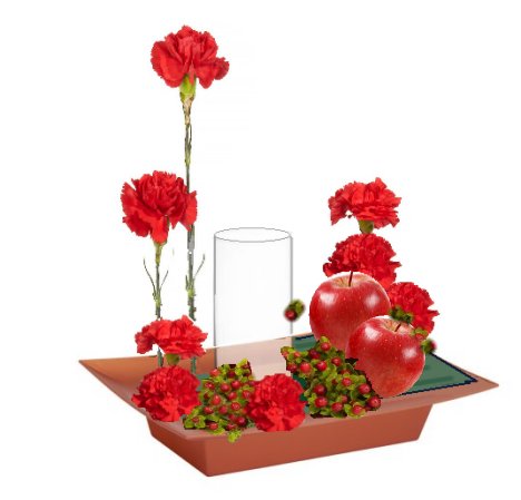 Begin clustering in hypericum berries, tucking them in between the carnations and apples.