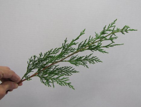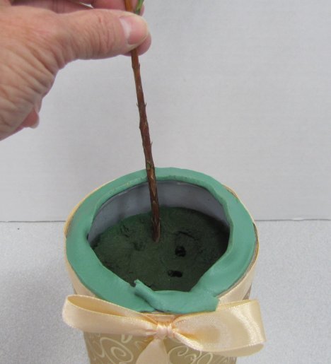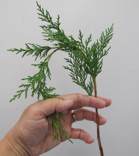Push the cleaned cedar stem down into the florist foam, tilting it just slightly to the back.