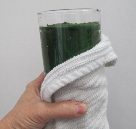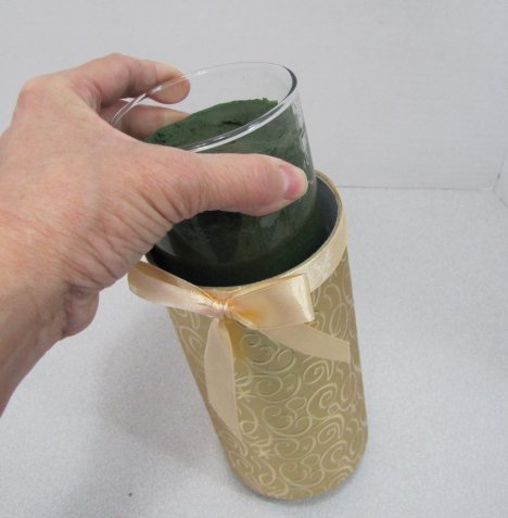 I lightly place the tacky florist clay into place, and then pat it down firmly so it is a snug fit. Now that glass isn't going to move and the water should always be channeled inside the container where it belongs.