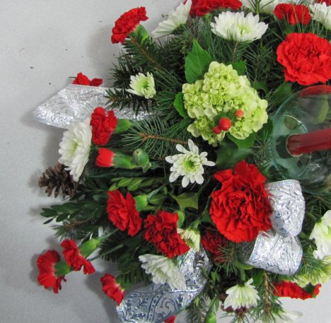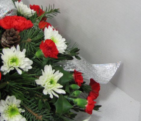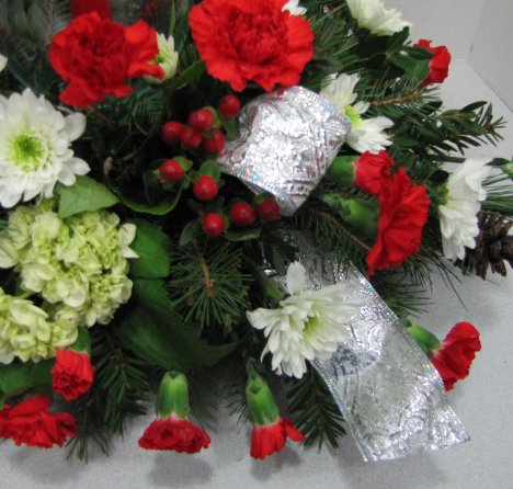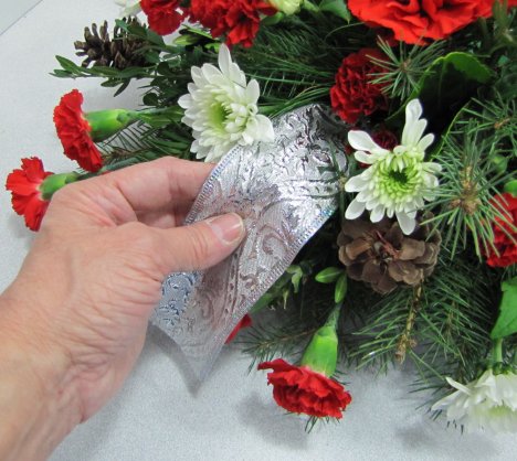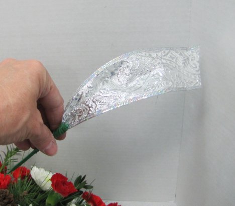 The wired edges makes this ribbon a dream to work with because I know it will stay in place and is impervious to water damage. Notice I usually place a loop somewhere above each flower tail.
