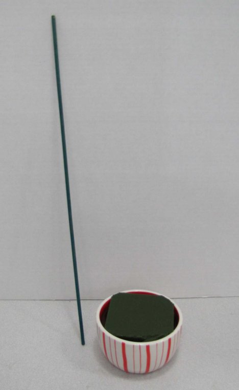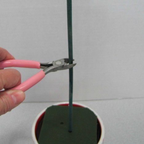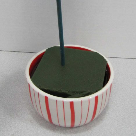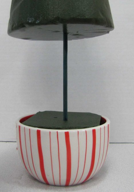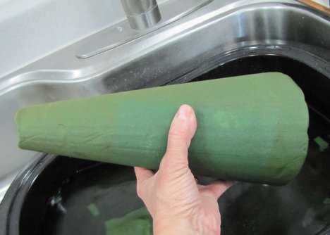 I will need to insert several more stakes, driven in at angles to assure a solid connection of the cone to the base foam. This ceramic container is pretty heavy, so it can handle the weight of the oversized florist cone.