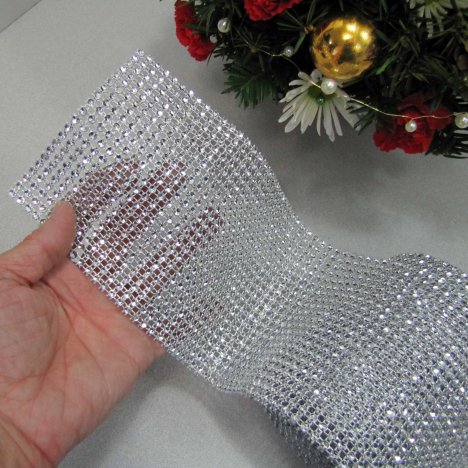 Although it looks like rhinestones, this is actually dimpled plastic with a metallic sheen. It can easily be cut and is impervious to water damage.
