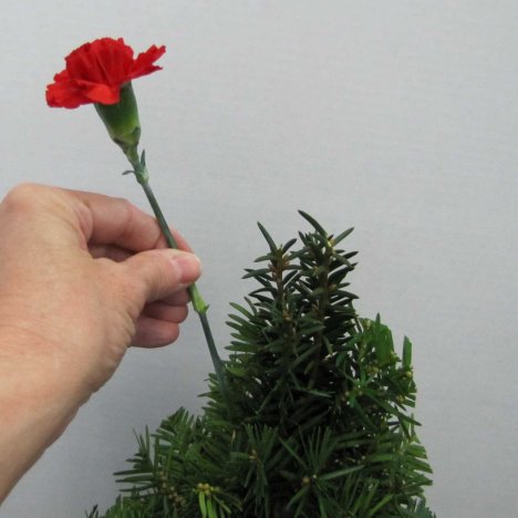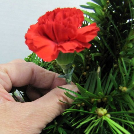Turn the tree around , staggering the carnations evenly around the tree.