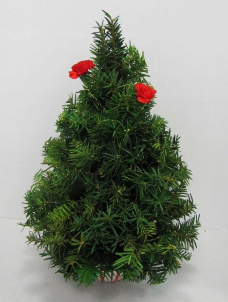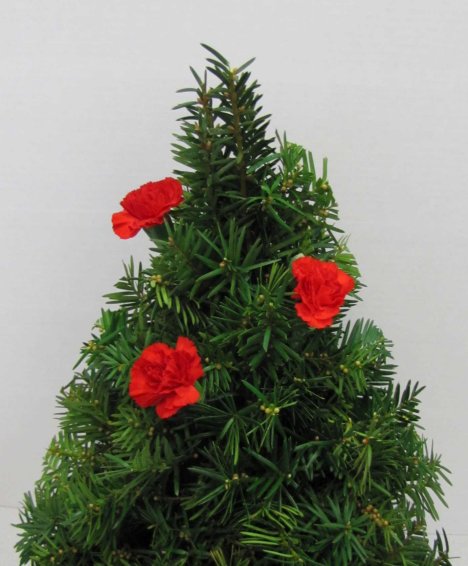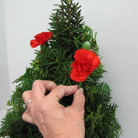 Now comes the time to start flowering in your Christmas tree design. Cut your stems down a little shorter and insert into the tree at a downward angle like you did the greenery.