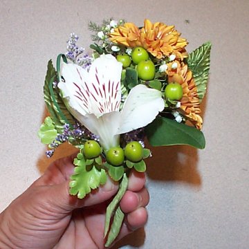 Chrysanthemum boutonnieres hold up well, especially in hot weather when compared to more delicate blooms. They are very hardy.