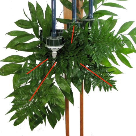 I continued to fill out this flower design by inserting leather into the center of the Oasis Jumbo cage. See the angles below. Leather is very easy to cut into smaller pieces, as they have miniature laterals up a very slender main stem.