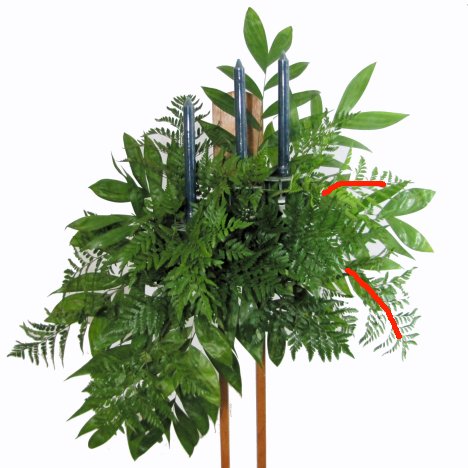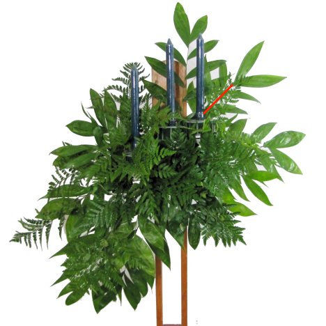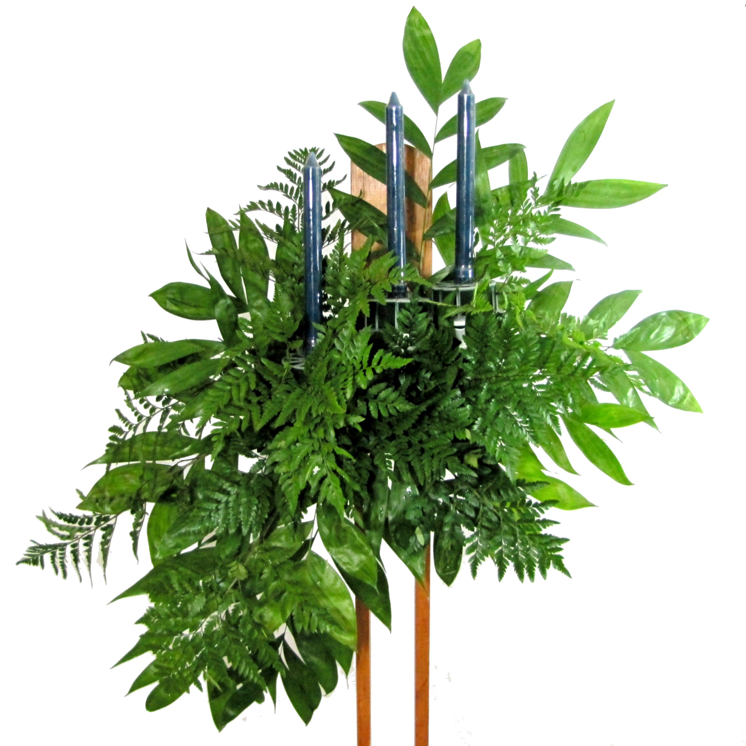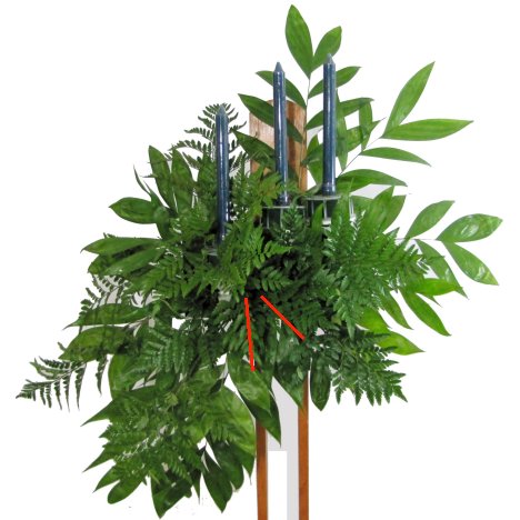 I've inserted blue candles just to give you a feeling of their placement. I plan on using much longer candles that rise above the greens, giving a more impressive look and keeping the flame away from the greens.