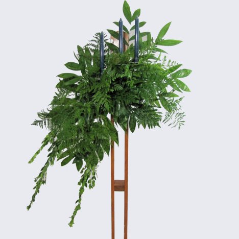Pulling away, you can see just three stems of greens instantly adds more interesting detail - even before the flowers are added! These pieces may have to wait until the piece is wired to the candelabra at the church. It depends on how much room you have in your delivery vehicle.
