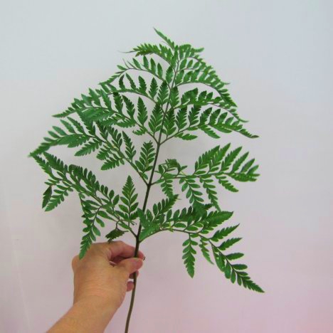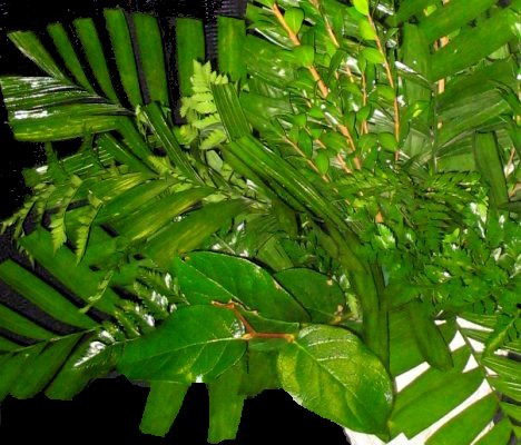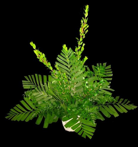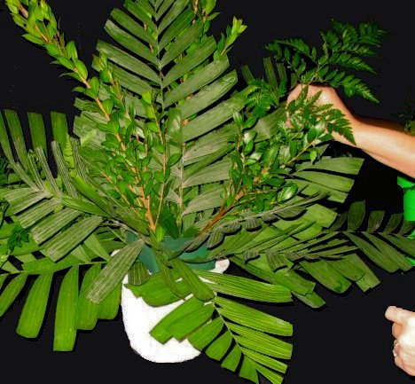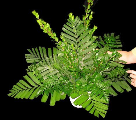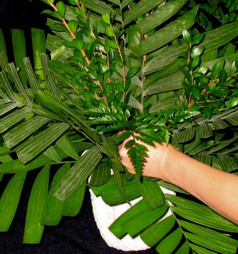 I begin inserting the leather leaf fern, always pointing the stem towards the center and angling out in all directions.