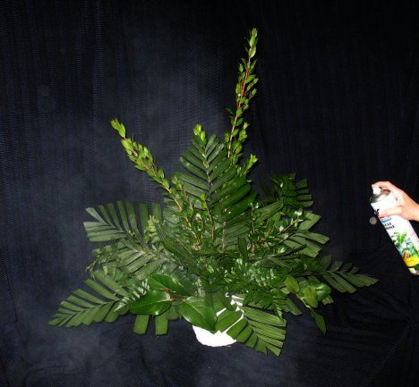 No matter what product you use, if it comes in an aerosol can you need to keep the nozzle a distance away from your greens or flowers. The propellant used in the can is very cold and can freeze fresh flowers.