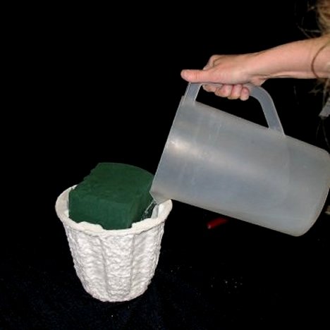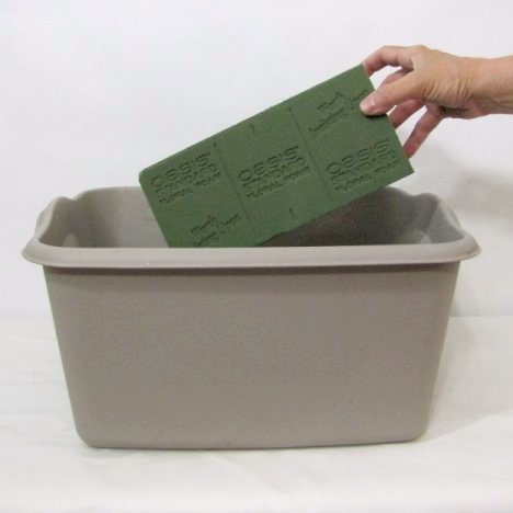 Whichever foam size you choose, you must first float soak it in water to which florist food has been added. I like to prepare several buckets of water ahead of time and add flower food as directed on the label.