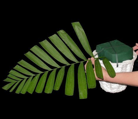 Once the leaf has been trimmed with scissors, I insert the first palm into the side of the arrangement. Now you can see why the foam needs to be raised above the rim of the container.