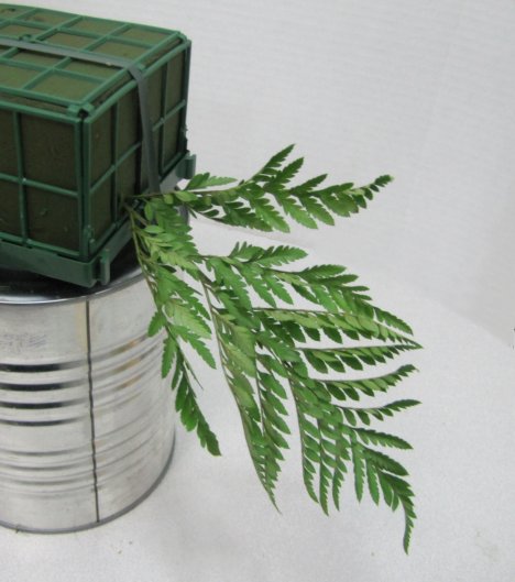 You'll see why I put this on a elevations (in this case, a large can of green beans! LOL). I want my side greenery arching downward like a natural plant grows. It looks better in the design and helps conceal the mechanics of the flower design when you are finished.