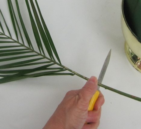 Using a sharp knife, cut the stem about halfway up. You will be using both ends, so don't discard the bottom half of the palm.