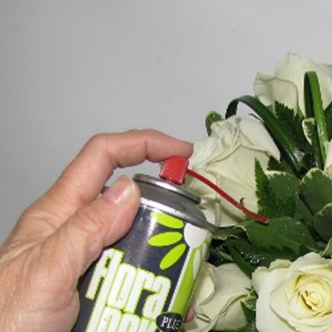 It is a spray adhesive made especially for fresh flowers. The long nozzle allows you to spray in deep among the flower stems where they are inserted into the wet foam. This "locks" them into place.