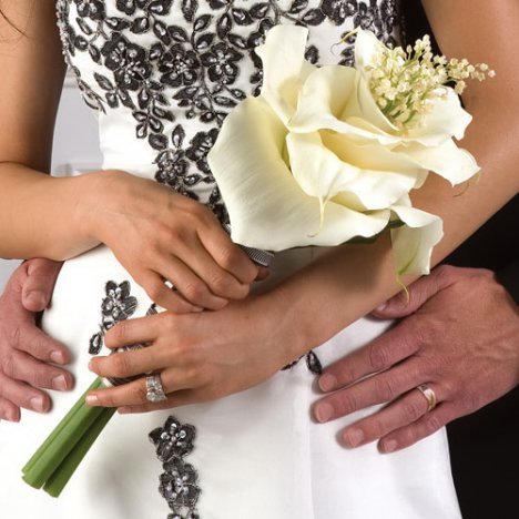 Gently open each lily and add beneath wired calla lily. Tape or glue into place. Continue until you’ve reached the desired size. Gather three to four cut stems and tape together to form handle. Attach stems to composite calla lily with glue or pins. Band with ribbon and secure with pins. Finish by gluing a small bunch of lily of the valley into the center of the composite flower.