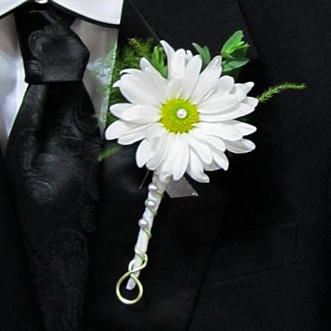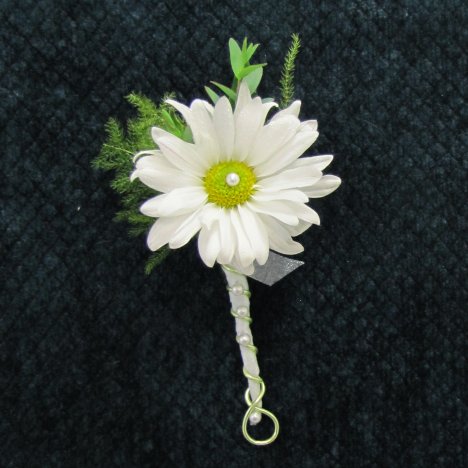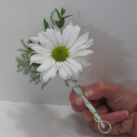 This daisy boutonniere finished with a cool wire wrap. Cut the wire off at the bottom of buttonhole flower, leaving a tail that you can curl up.