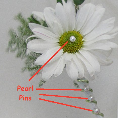 After safely shortening your pins, you can use them in different ways to enhance your boutonniere design. Here I inserted a pearl pin in the center to conceal where the wire hook is buried.