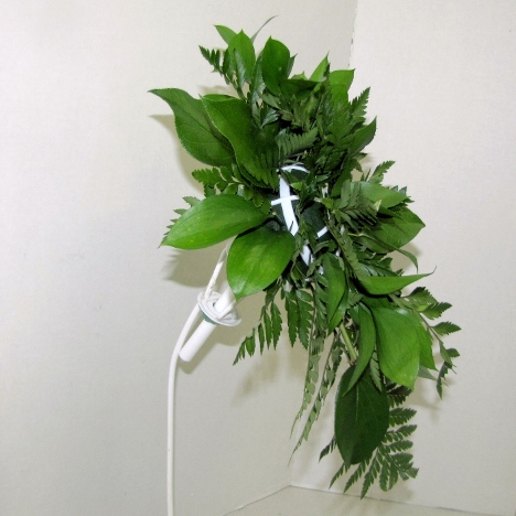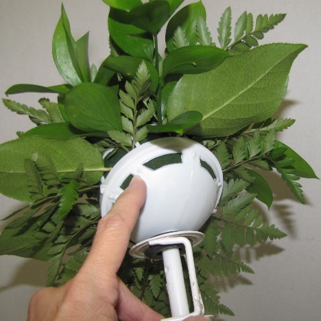 If you wish, you can glue salal leaves to the underside of the bouquet holder, concealing the white bottom of the holder completely. Another choice is to create a salal leaf collar and add stems so that it looks like a hand-tied bouquet.