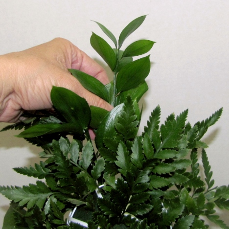 I saw a hole in the top where I tucked another tri sprig of ruscus.