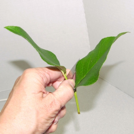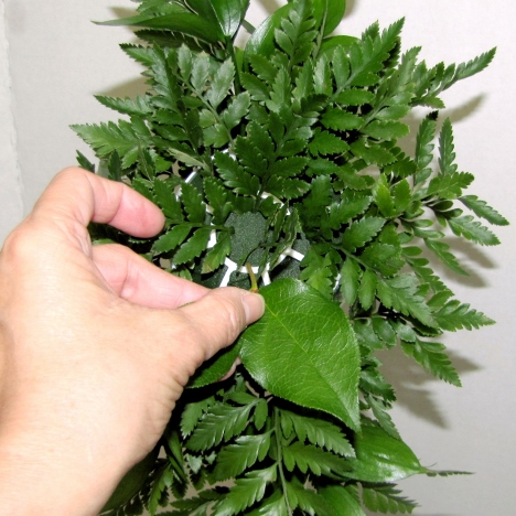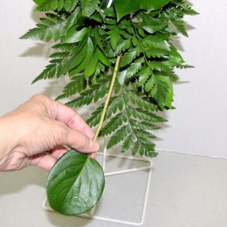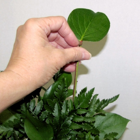 I strip off the bottom leaves from a salal stem (also commonly known as "Lemon Leaf) so I can have a longer stem.