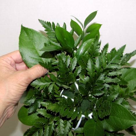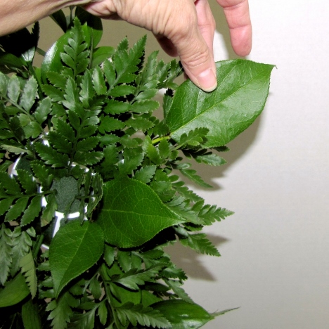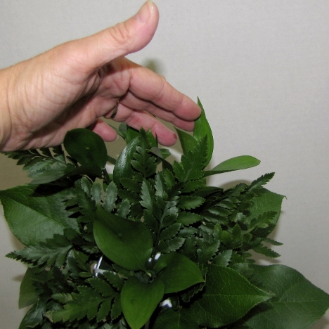 Scatter some salal all around the bouquet design, Don't forget looking from the lateral (side) view frequently as you build your bouquet.