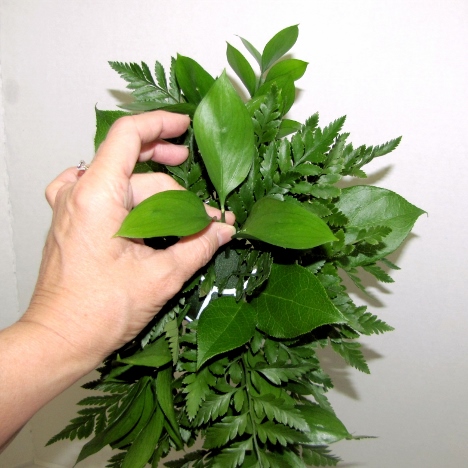 I decided to insert a tri-leaf section of ruscus right in the direct center of the bouquet holder.