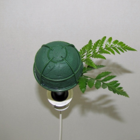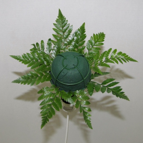 Fill in, working your way around the foam. The leaves should be inserted at a 90 degree angle from the center of the bouquet.